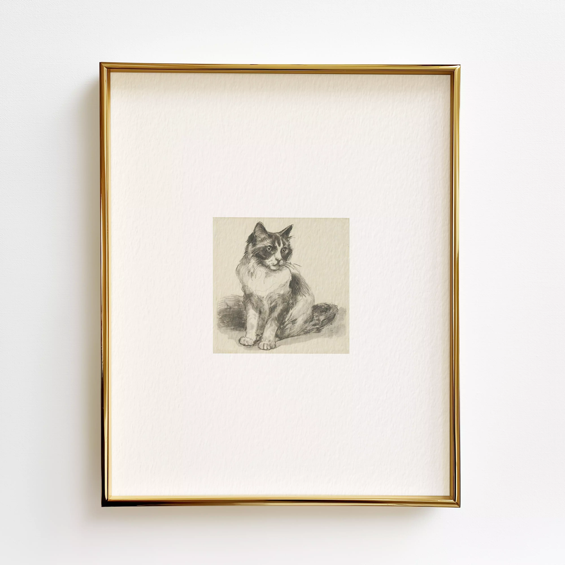 Antique style cat sketch printed on Somerset fine art paper. A cherished choice of artists and printmakers since the 1700s, this 100% cotton rag, acid-free paper highlights rich colors and gentle textures. Our giclee printers use aqueous pigment inks that will resist fading and help your print last for generations. With its soft palette and minimalist detail, this classic artwork adds a sophisticated touch to any gallery wall, entryway, or bedroom. Whether you're curating vintage art or searching for the perfect cat lover gift, this print will bring warmth and charm to your space.